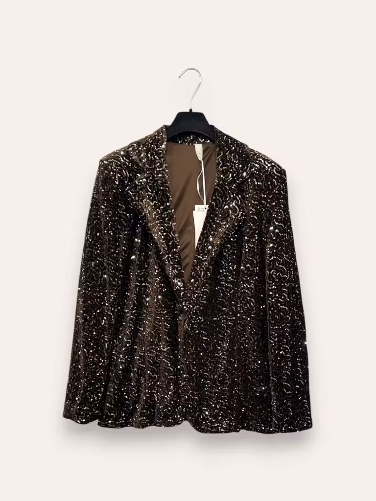 Fodrad kavaj med blingpaljetter och axelvaddar.