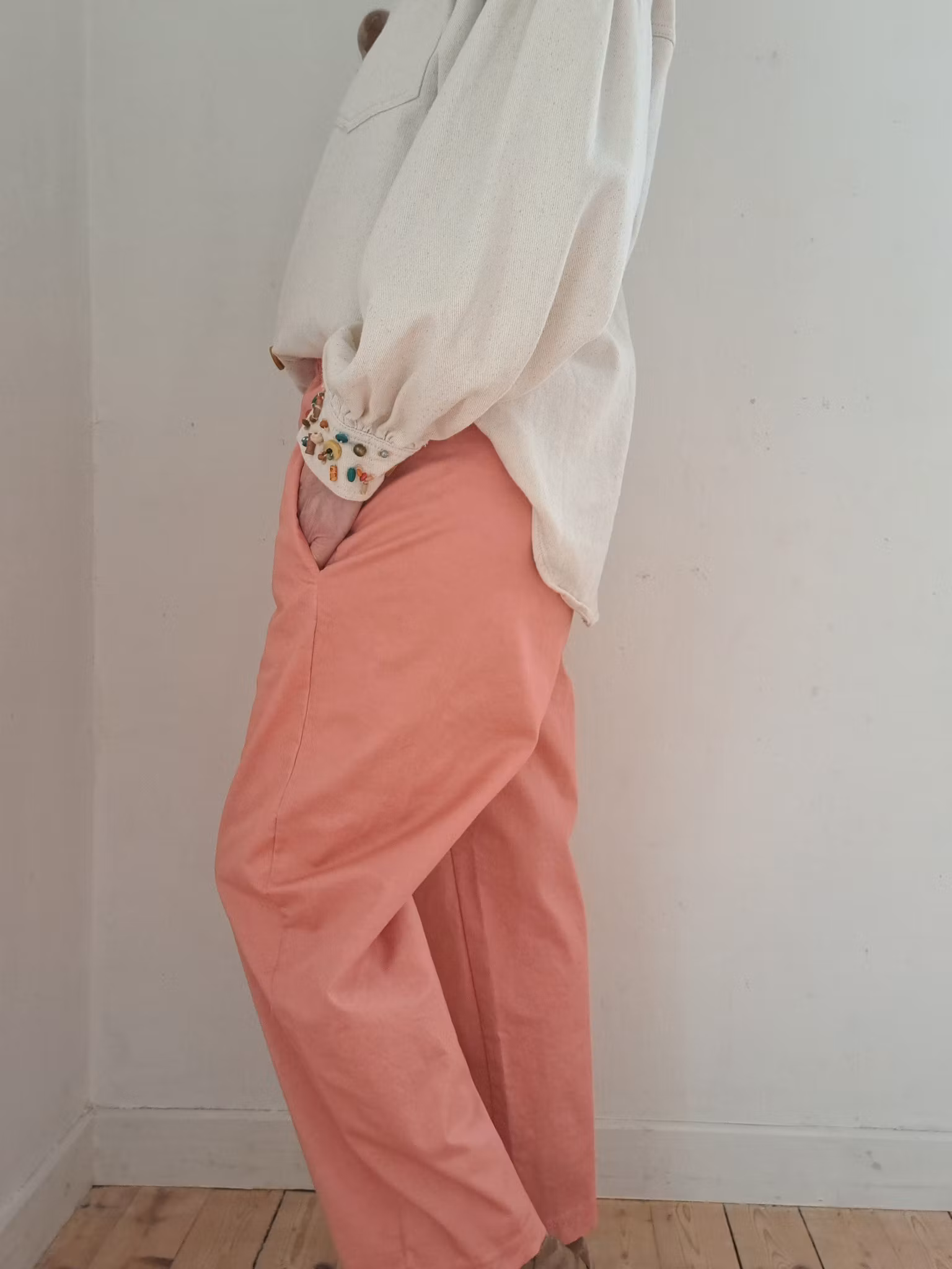 Härlig byxa i en fin corallton med sidfickor och resår i midjan.