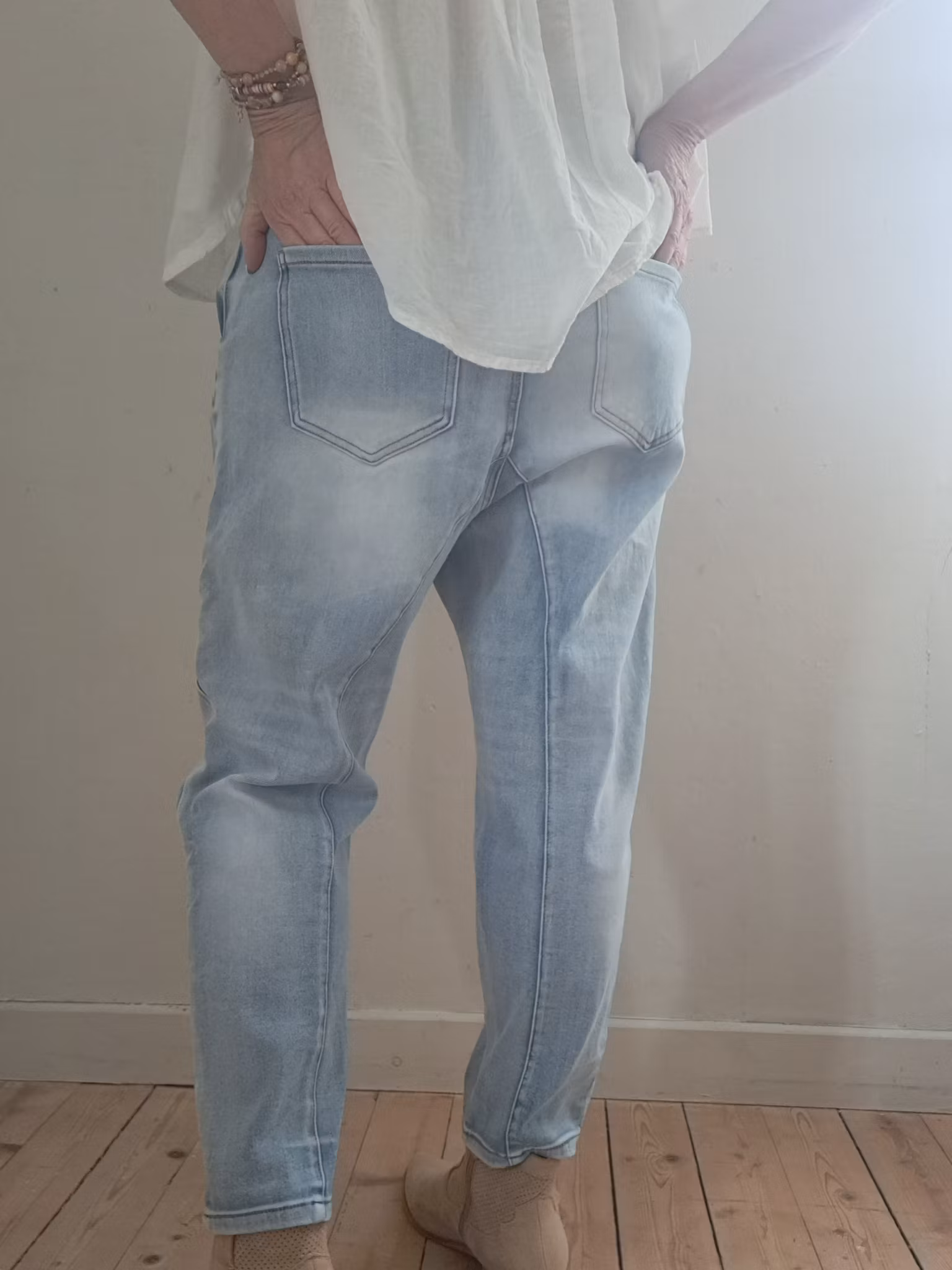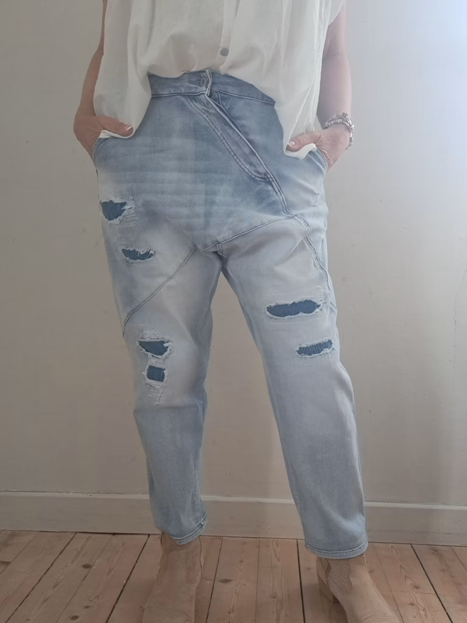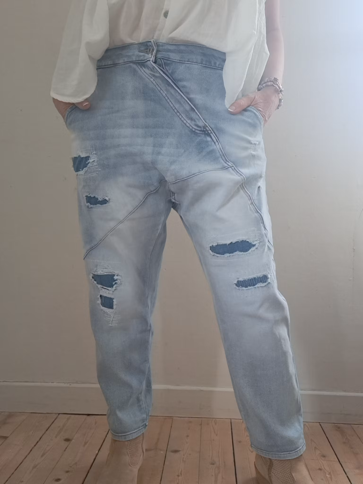 Tuffa jeans i baggymodell med sned knäppning.
