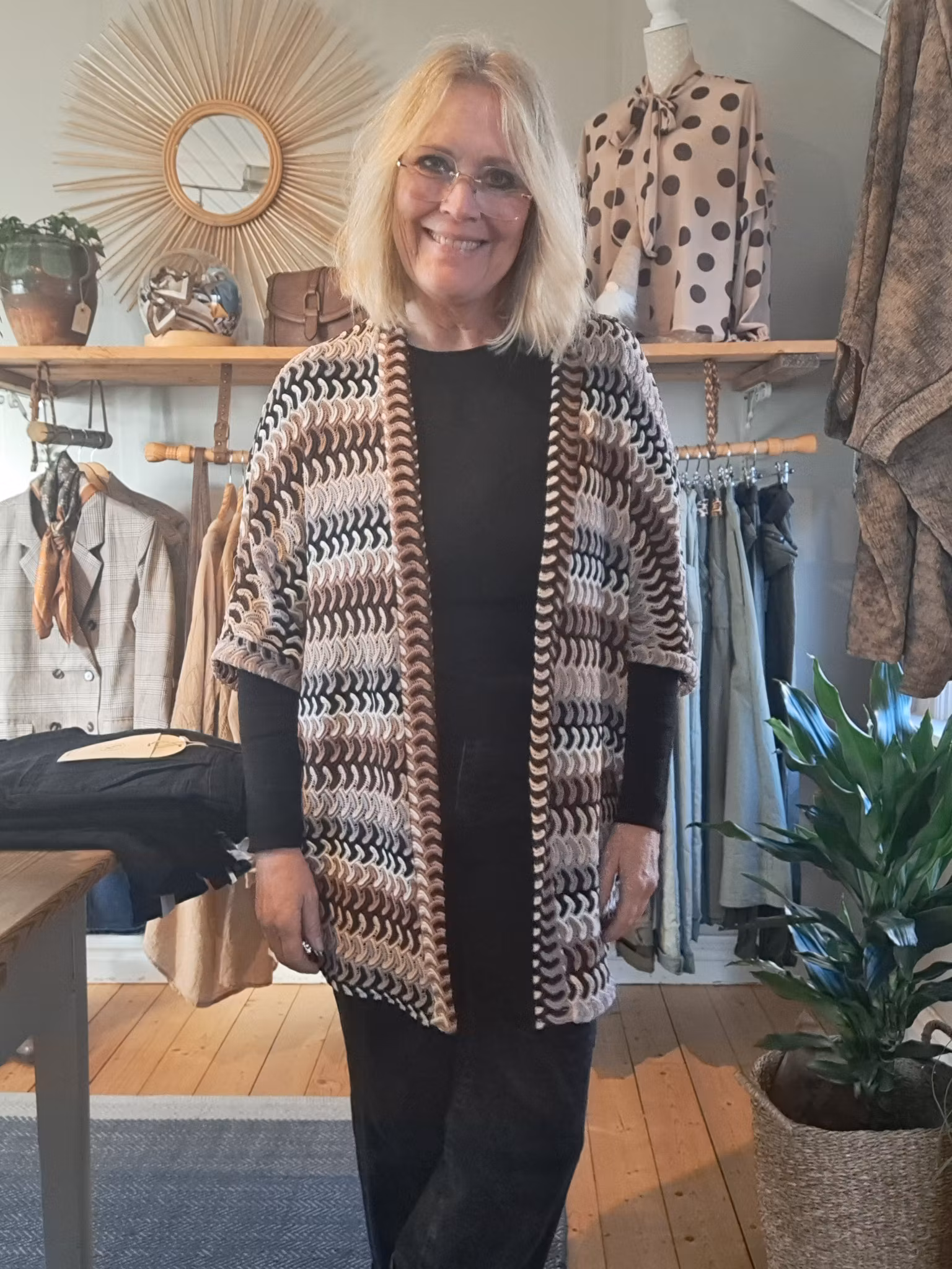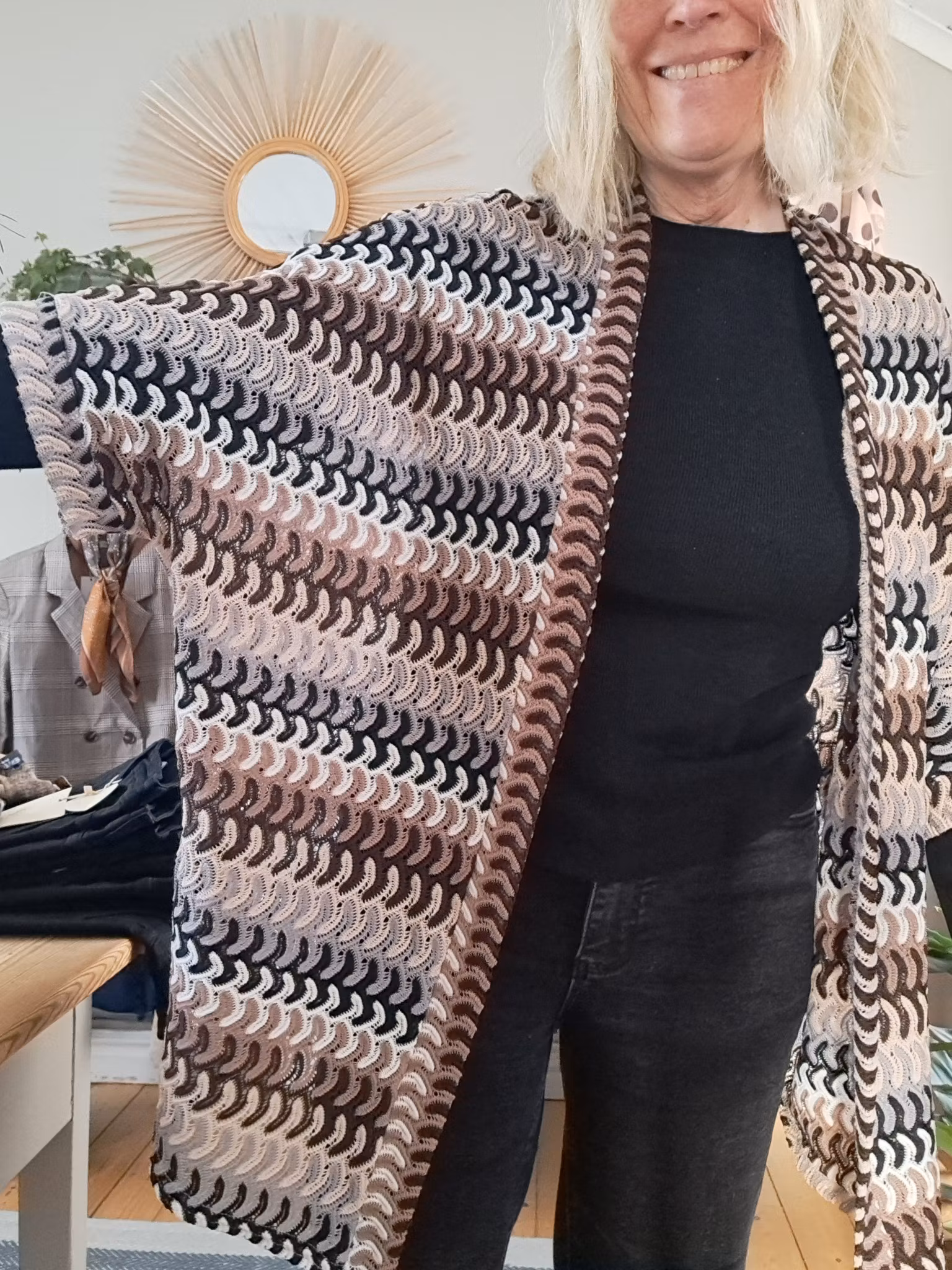 Lättburen kimono i beige, bruna o grå toner.