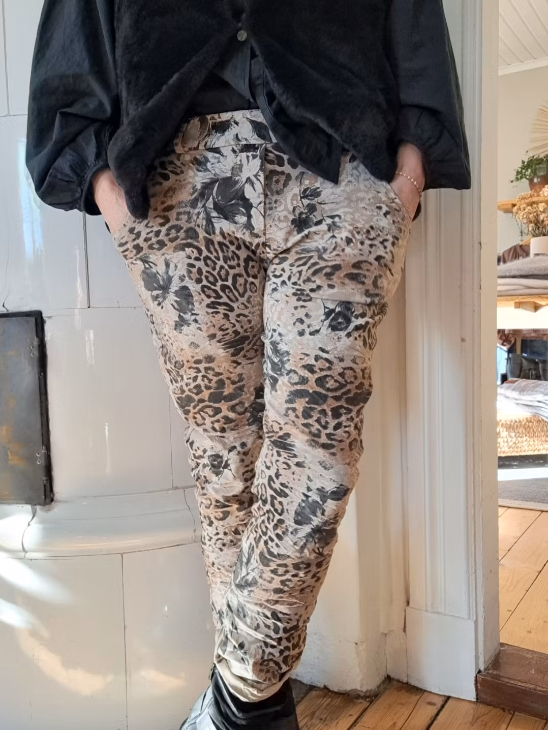 Skönaste byxan i fint print med toner i taupe, svart, beige och brunt med tillhörande bälte.