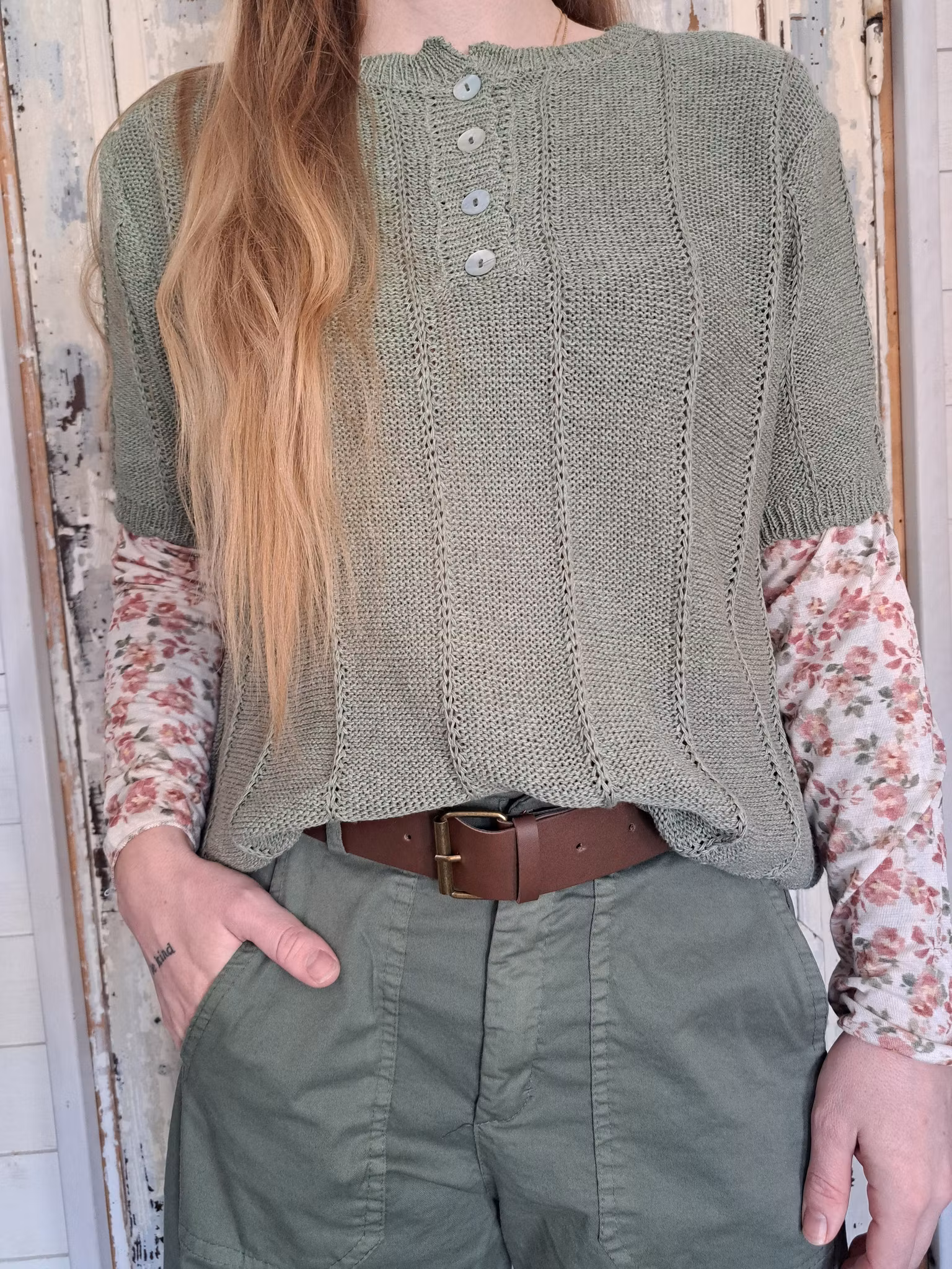 Tunnstickad, kortärmad tröja med pärlemoknappar.