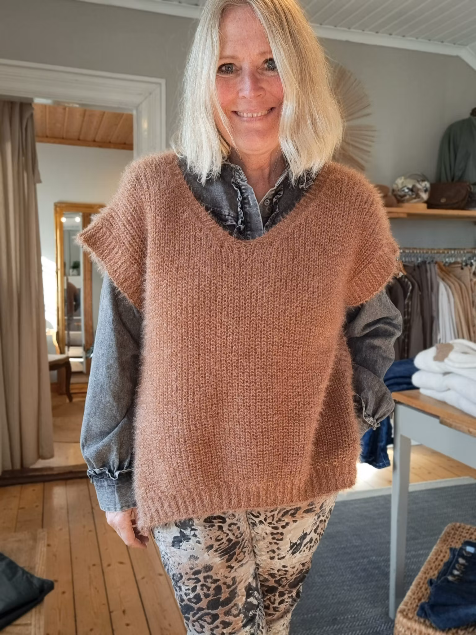 Stickad väst i fin camelton med lite lyster. Helt öppen förutom att den knäpps med en knapp i sidan.